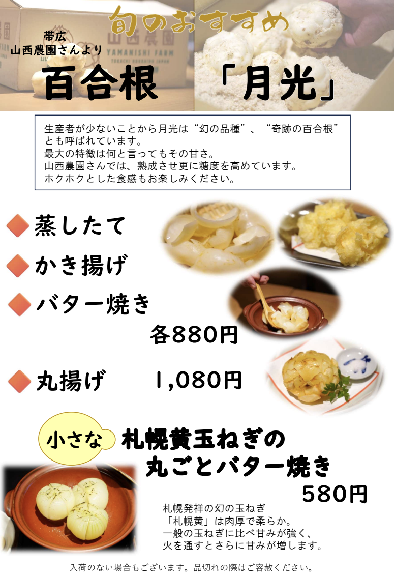 ① 魚介たっぷり海鮮鍋 ②札幌黄玉ねぎの 丸ごとバター焼き ③北海道産 真たち
