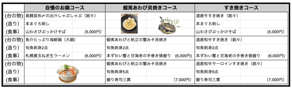 ※宴会コース料理のみも承ります。こちらのコースは料理のみ5000円(税込)です。