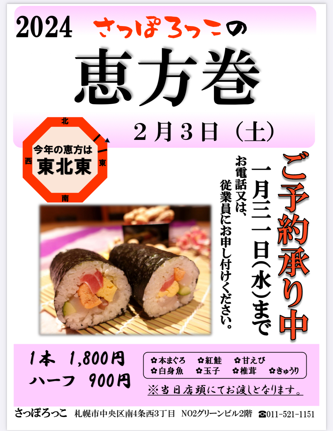 ホームブログ 今年も、さっぽろっこの恵方巻を販売いたします。 2024年1月22日 SHARE ポスト シェア はてブ LINE 今年も、さっぽろっこ特製・厳選素材の恵方巻を販売いたします。 ※1本とハーフサイズからお選びください。 ※さび抜きはご注文時にお伝えください。 コメントを残す コメントをキャンセルメールアドレスが公開されることはありません。 ※ が付いている欄は必須項目ですコメント ※ 名前 ※ メール ※ サイト 上に表示された文字を入力してください。