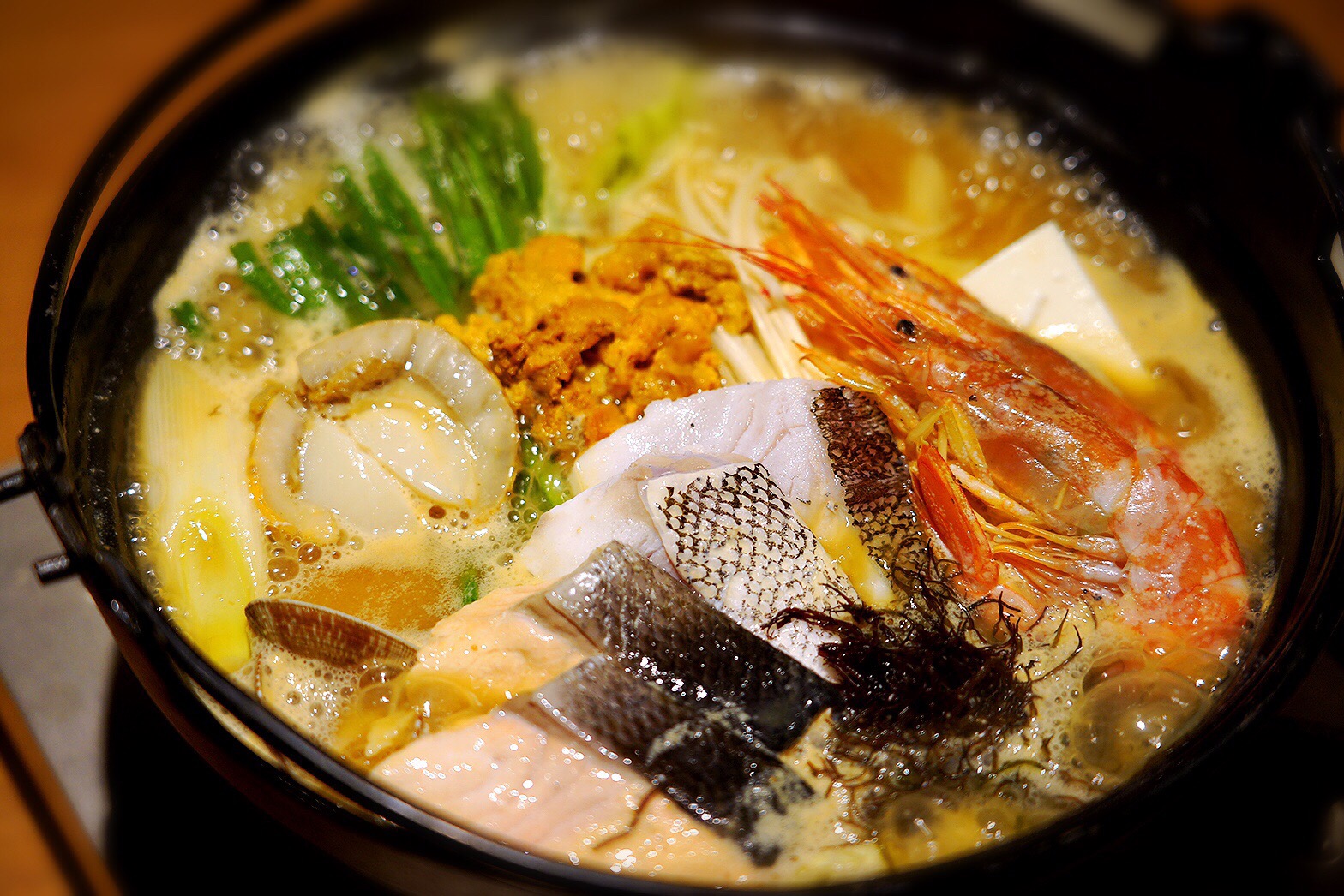 <ウニ入り豪華海鮮のみそ味鍋。さっぽろっこ秘伝の特製合わせ味噌を使用。>